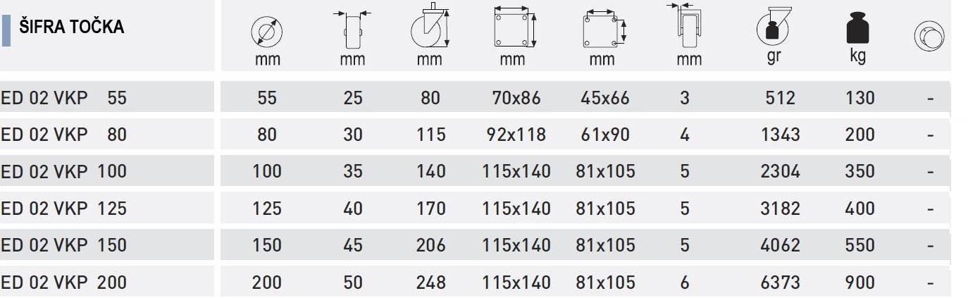 Stabilni točak od livenog čelika obložen poliuretanom, nosivosti od 130 do 900 kg. Viljuška napravljena od presovanog čelika, ojačana i kaljena, centar točka napravljen od livenog gvožđa, gazeći deo od poliretana 95 šora, sa mazalicama i kugličastim ležajevima.