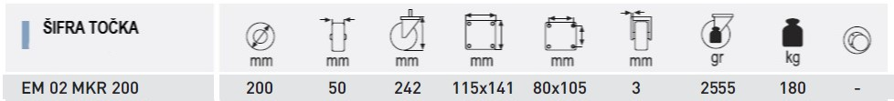 Točak stabilni od polipropilena. Viljuška napravljen aod presovanog čelika, centar točka napravljen od polipropilena, gazeći deo napravljen od crne gume 85 šora, bez ležajeva.