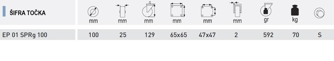 Okretni točak, sa sivom gumom koja ne ostavlja trag. Viljuška napravljena od presovanog čelika, dupli kuglični ležaj, centar točka napravljen od presovanog čelika, gazeći deo siva guma 85 šora, plastični ležajevi.